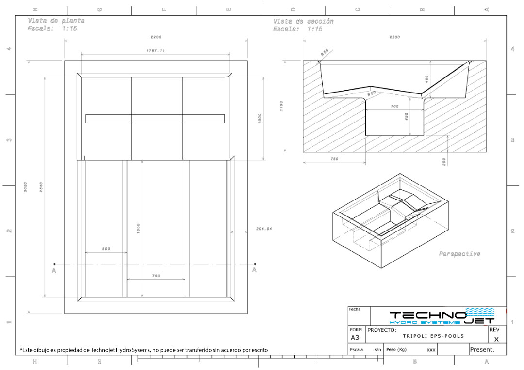 Todos los componentes hidráulicos y tuberías discurren por el interior de las paredes del vaso hasta la ubicación seleccionada para el local técnico, dejando el vaso totalmente libre por su exterior.